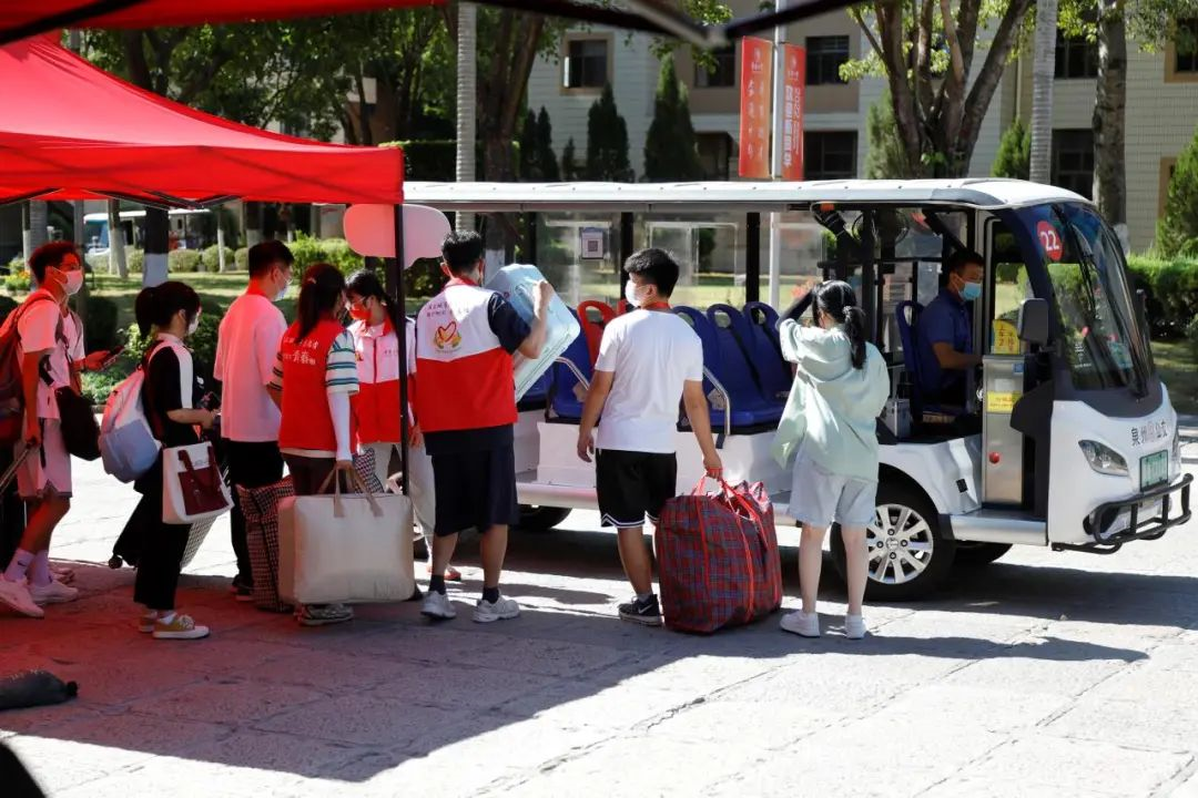 在疫情常态化防控背景下,学校推出一系列举措,确保新生顺利入校。在校外,泉厦两地的动车站与机场,都设有专门的迎新接站点,学校专车接送。抵达校门口,进入入校通道后,学生进行手部消毒、测温后便可进入身份登记核验区,随后等待由专车接送到宿舍楼,再前往各学院迎新点办理入学手续。