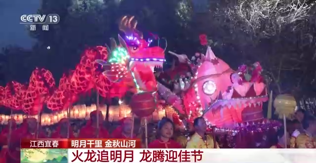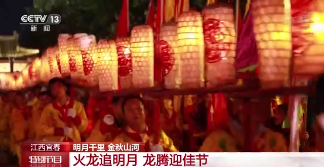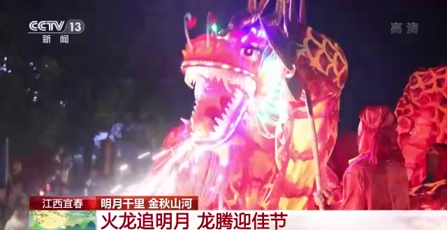 总台记者 鄢俊琪:我身后的这几条龙,其实是当地的一个叫做“火龙追月”的表演,这也是宜春当地中秋节最经典的活动之一。今天现场总共是有七条龙,分别是两条板凳龙和五条九节龙,总共是有200多米长,刚刚我也尝试着去跟他们一起去舞动这个龙,其实感觉并没有那么容易,他们每个人平均要肩负三到五斤的重量,龙头更是达到了24斤重,所以并不像他们看上去那么轻松。