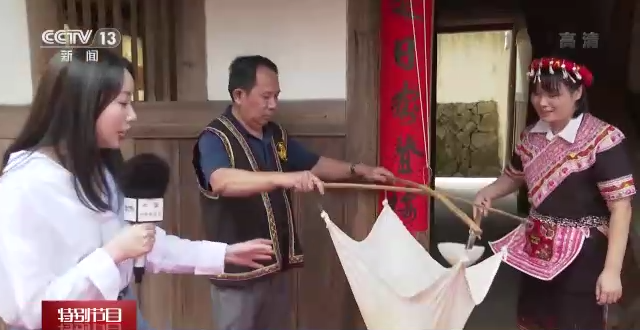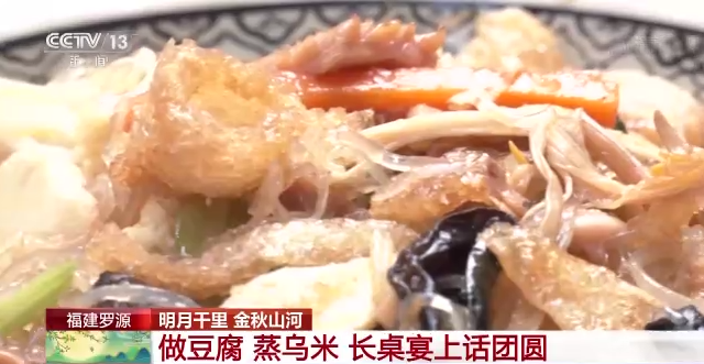 总台记者 祝镜涵:中秋节最热闹的就是畲乡长桌宴,长桌宴是畲族招待客人的传统。老乡们常说“请客没有黄豆腐,山哈并非有诚意”,黄豆腐是招待客人必不可少的菜肴。