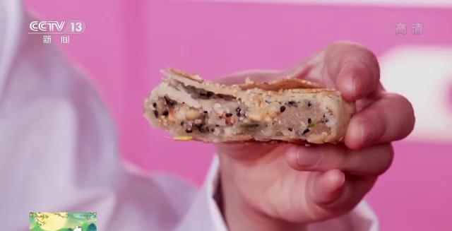 总台记者 祝镜涵:说到畲族最有特色的月饼,就是麻饼,馅儿是用腌好的肥猪肉、花生、芝麻、香葱做成的,吃起来表皮酥脆,里面十分油润,有咸有甜,口感丰富。小小的麻饼是当地人的一口乡愁,在一些重要的节庆活动比如孩子满月、成人结婚、老人过寿,都要吃麻饼。