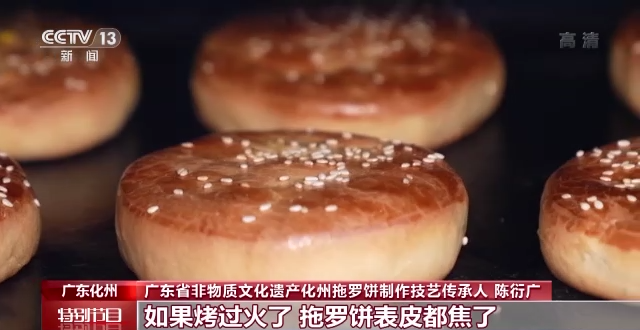 广东省非物质文化遗产化州拖罗饼制作技艺传承人 陈衍广:做这么大的拖罗饼放在里面烤,大概是要烤20分钟,如果烤过火了,拖罗饼表皮都焦了,而且吃起来有一点苦味。但是拖罗饼如果没有烤够火,拖罗饼吃起来不香,口感不好。