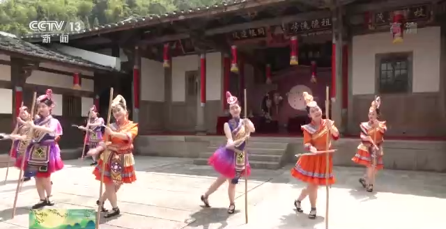 总台记者 祝镜涵:这里是罗源县白塔乡的南洋村,今天这里非常热闹,老乡已经跳起了畲族的传统舞蹈——打枪担。姑娘们一手拿着柴刀,一手握着竹竿,随着鼓点的节奏边跳边敲。这个竹竿,当地人又叫它枪担,是用来挑柴火的一种劳动工具。过去,乡亲们上山砍柴的时候,都会带着这根竹竿,一旦遇到猛兽或其他危险,就会用这根竹竿敲击地面,发出声响或警报。演变到今天,就是我们看到的“打枪担”舞蹈,这也是当地中秋节必不可少的民俗活动。