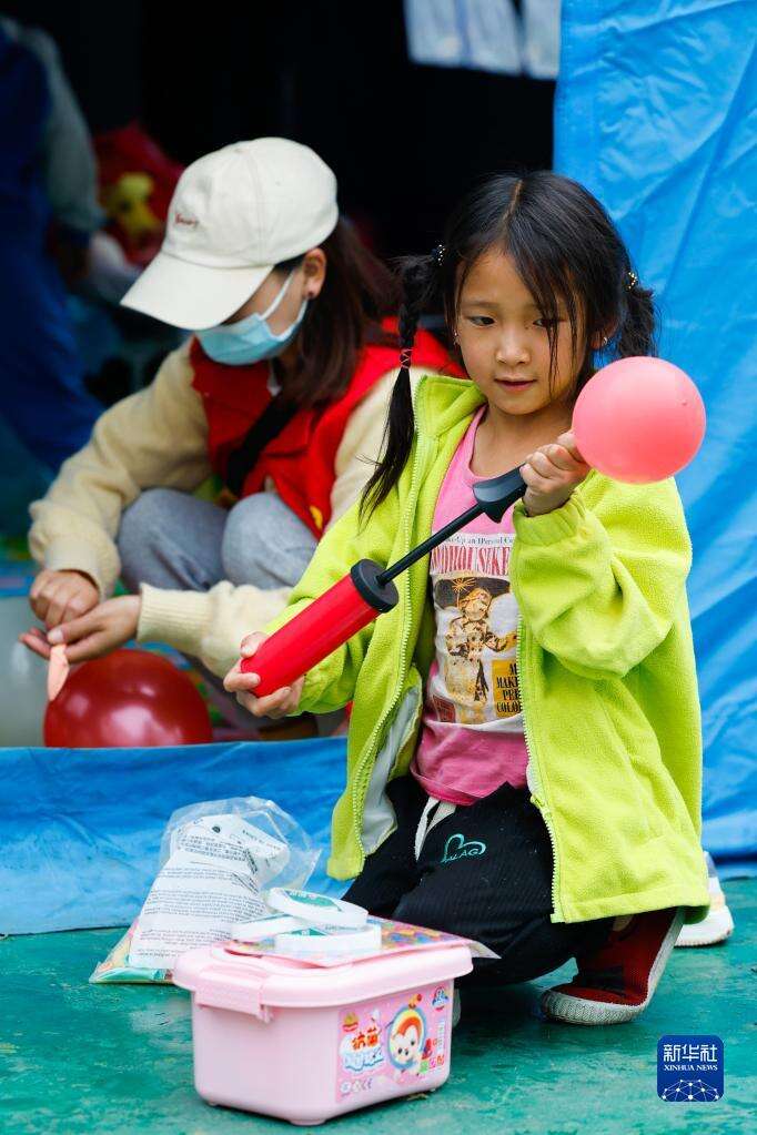 9月10日,在泸定二中临时安置点,一名来自得妥镇的小朋友在帮志愿者打气球。