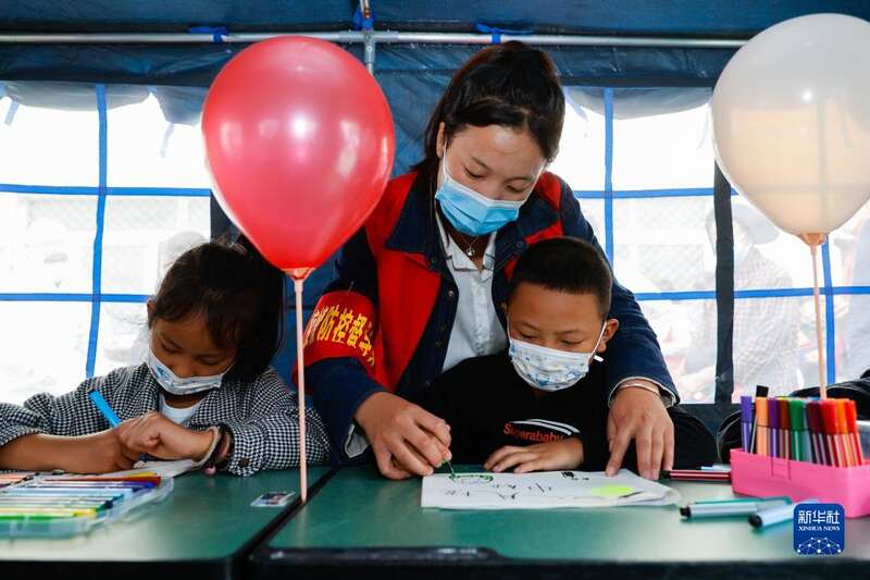 9月10日,在泸定二中临时安置点的“帐篷课堂”里,老师志愿者孙燕(中)在教孩子画画。