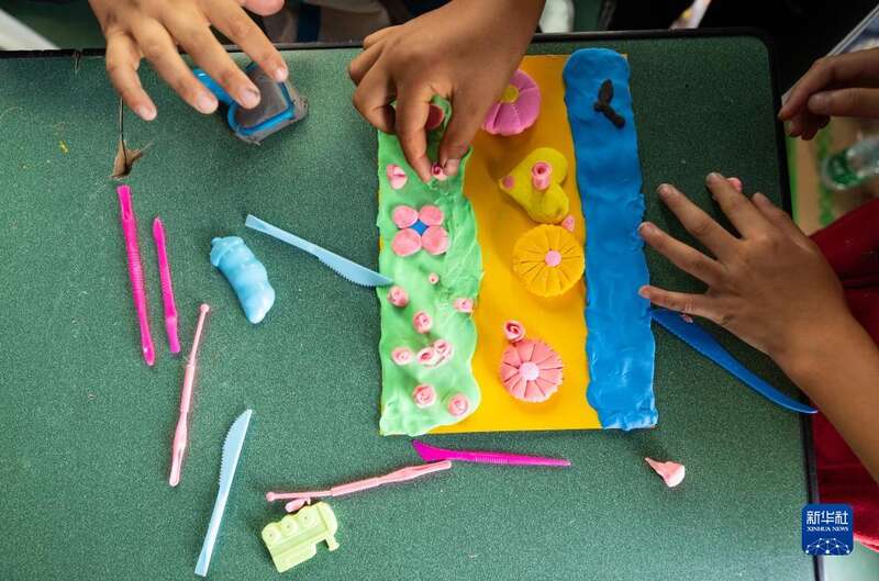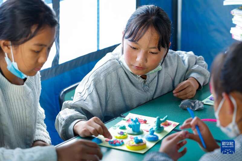 9月10日,在泸定二中临时安置点的“帐篷课堂”里,来自得妥镇的孩子们用橡皮泥制作创意“月饼”。