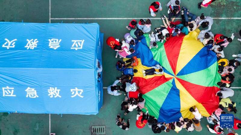 9月10日,在泸定二中临时安置点,孩子和志愿者一起玩彩虹伞游戏(无人机照片)。