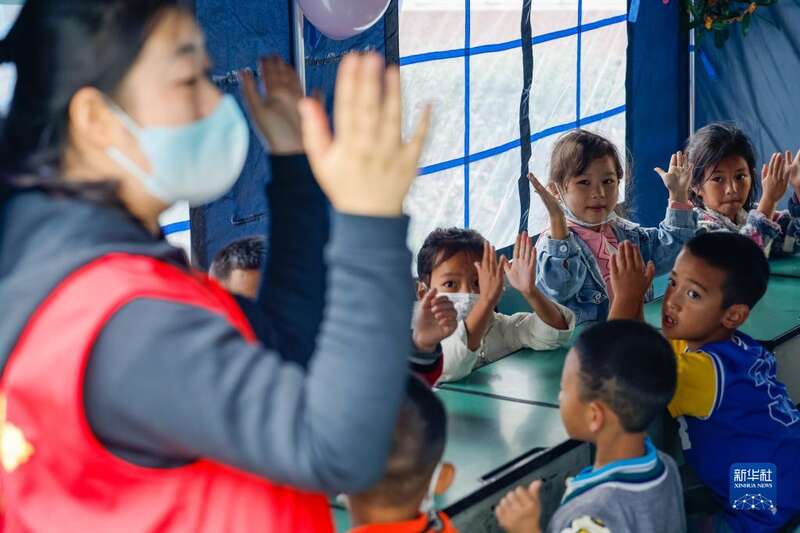 9月10日,在泸定二中临时安置点的“帐篷课堂”里,志愿者在教孩子手语游戏。