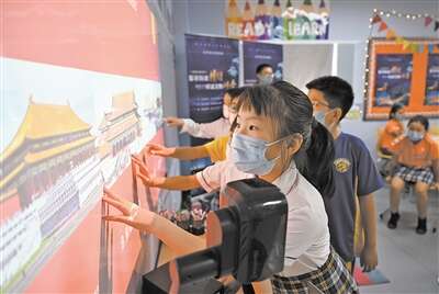 北京顺义国际人才社区办、顺义区空港街道开展“探寻历史精髓 对话文物传奇”博物馆教育进学校、进社区系列活动。图为学生们在学习古建筑知识。 史诺摄