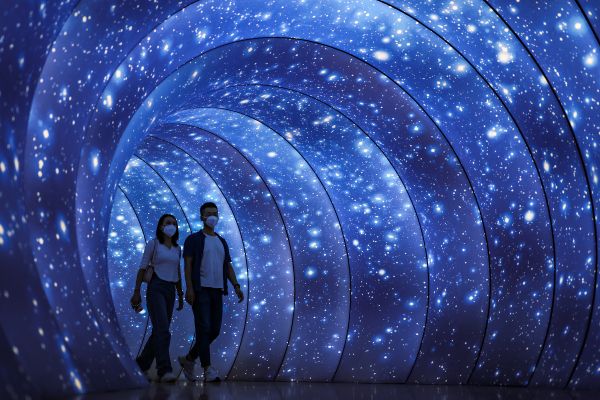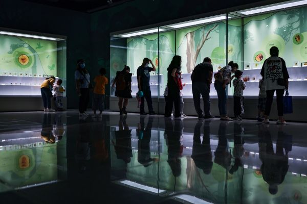 2022年9月12日,太原,中秋小长假,青少年来到山西博物院,借助AR智能眼镜设备观看世界虫珀真品展。