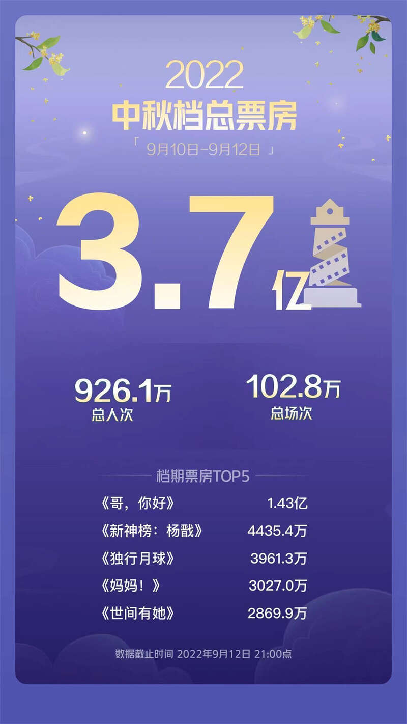 据灯塔专业版,截至9月12日23时,今年的中秋档电影票房达3.73亿,较2021年的4.99亿下滑25%。常远、马丽、魏翔主演的喜剧电影《哥,你好》以1.44亿的档期票房成绩领跑,《新神榜:杨戬》《独行月球》暂列二、三位。