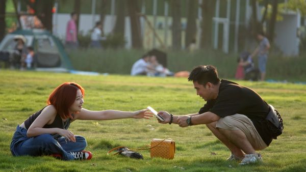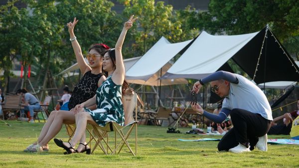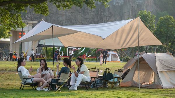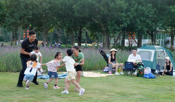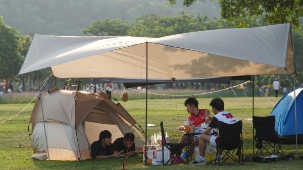 2022年9月12日,广东珠海,中秋节假期的最后一天,市民在海天公园搭起帐篷,在绿地上席地而坐或围坐在一起,一边品尝美食,一边享受中秋假期户外休闲生活。