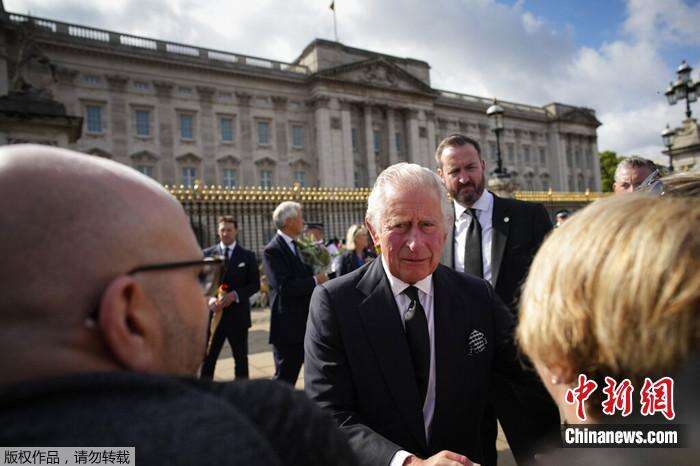 当地时间2022年9月9日,英国伦敦,英国王查尔斯三世在白金汉宫外迎接哀悼者。