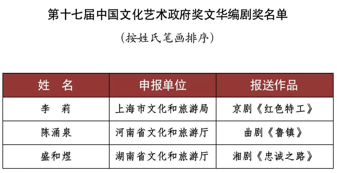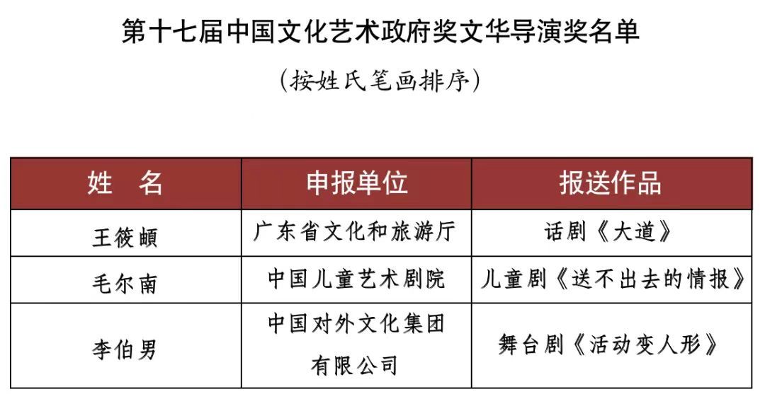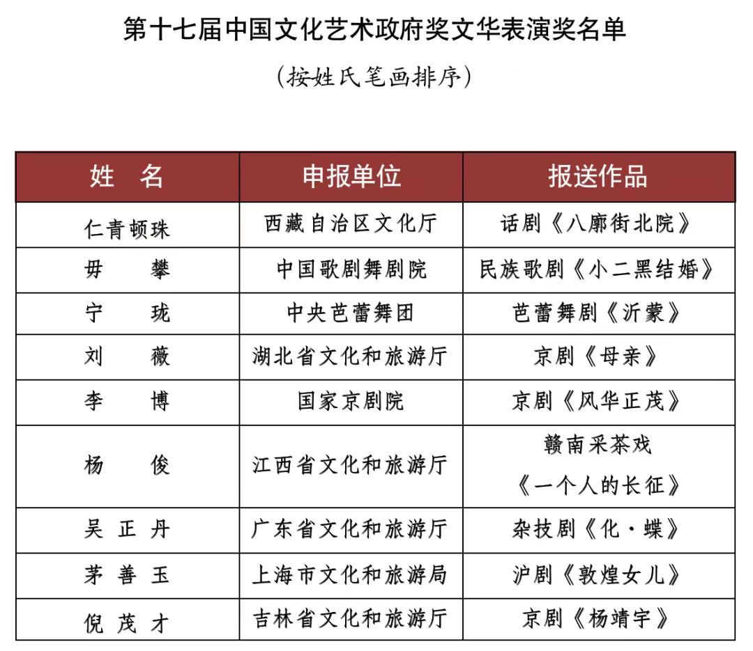 根据《中国文化艺术政府奖——文华奖章程》《中国文化艺术政府奖——第十七届文华奖评奖办法》,经第十七届文华奖评奖委员会组织专家评审,并报文化和旅游部批准,中国文化艺术政府奖——第十七届文华奖评选结果如下: