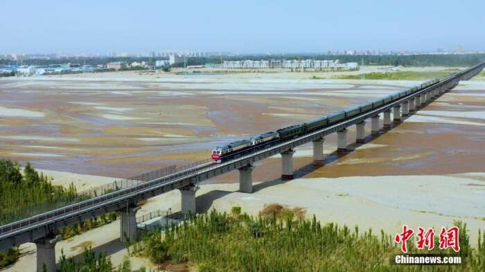 资料图:6月16日,和若铁路开通运营,首发列车穿过和田玉龙喀什河。 穆合塔尔 摄