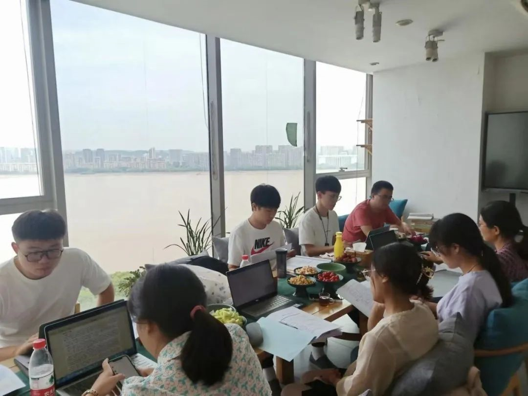 这是2022年盛夏 浙江大学历史学院(筹)冯培红老师 开办的本年度第18次研读会现场。冯培红带着8位学生,一同来到钱塘江畔,进行《晋书》五凉史料校注的研读。