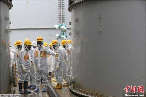 资料图:日本核监管机构工作人员身穿保护服和面具检查福岛第一核电站污水储藏罐。