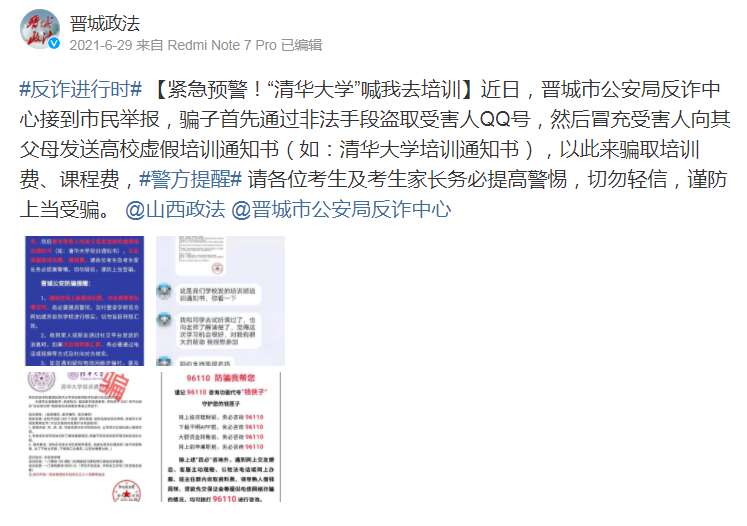 近日,福州多位市民反映收到来自“清华大学”的培训通知书,称要开设语数英等多门学科的培训课程,培训成绩前30名保送重点大学就读。