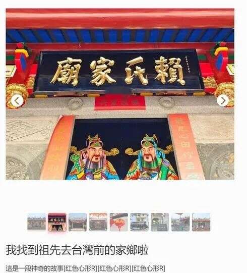 9月11日,赖赖在社交媒体发文告知网友“我找到祖先去台湾前的家乡了”,网友们再次给予了热烈回应——