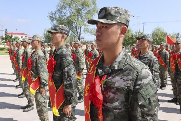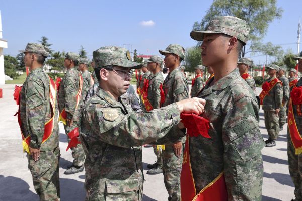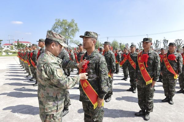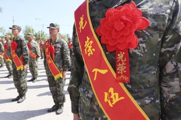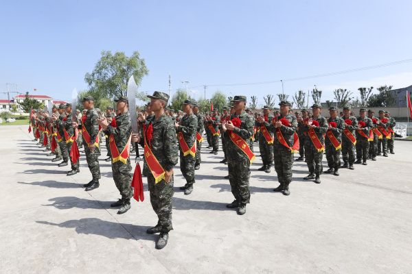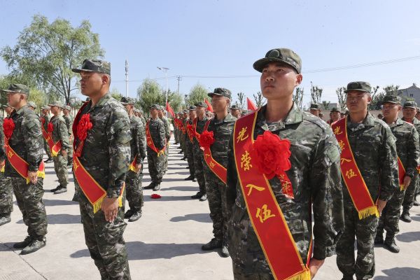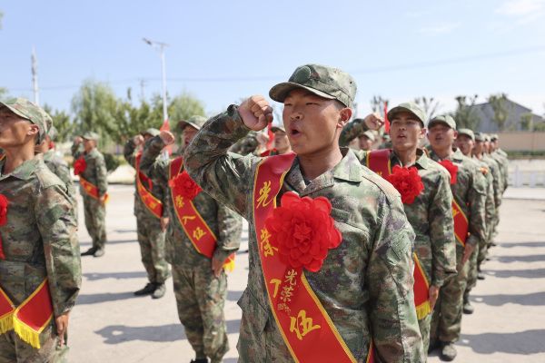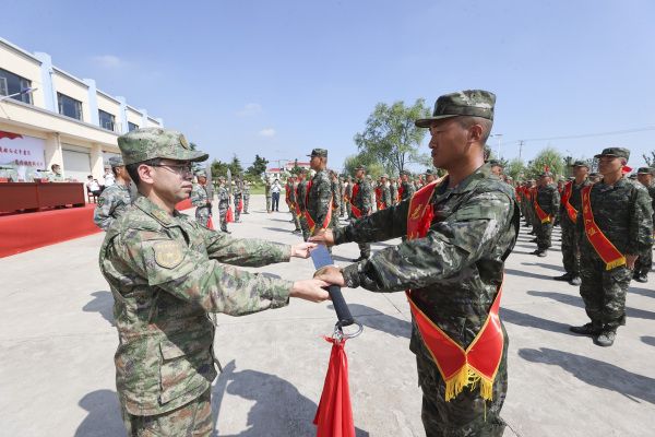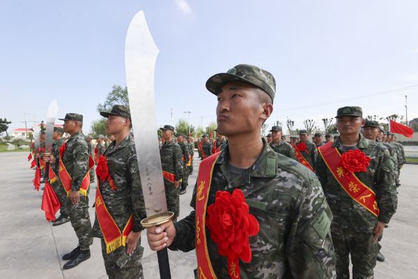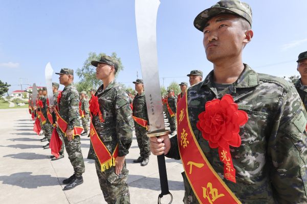 2022年9月17日,江苏省连云港市,赣榆区举行“擎起家乡战旗 接过勇士战刀”2022年秋季入伍新兵欢送大会上,新兵接过“十八勇士战刀”。