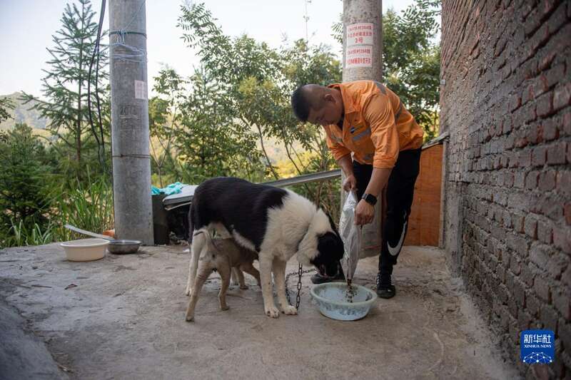9月19日,看守员赵伟灯在赤岭隧道防洪值守点投喂宠物狗。深山里的值守点人烟稀少,宠物狗是看守员们值守期间仅有的伙伴。