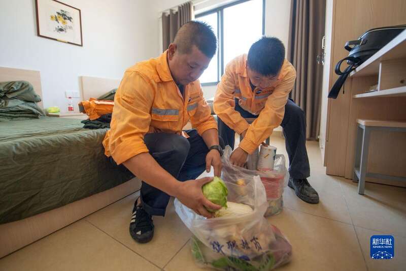 9月19日,看守员赵伟灯(左)与蔡金矿在寝室内准备值守期间的各类生活物资。