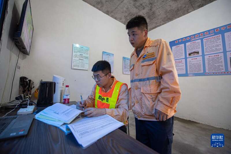 9月19日,看守员蔡金矿(右)在赤岭隧道防洪值守点与看守员芮澎湃交接工作。
