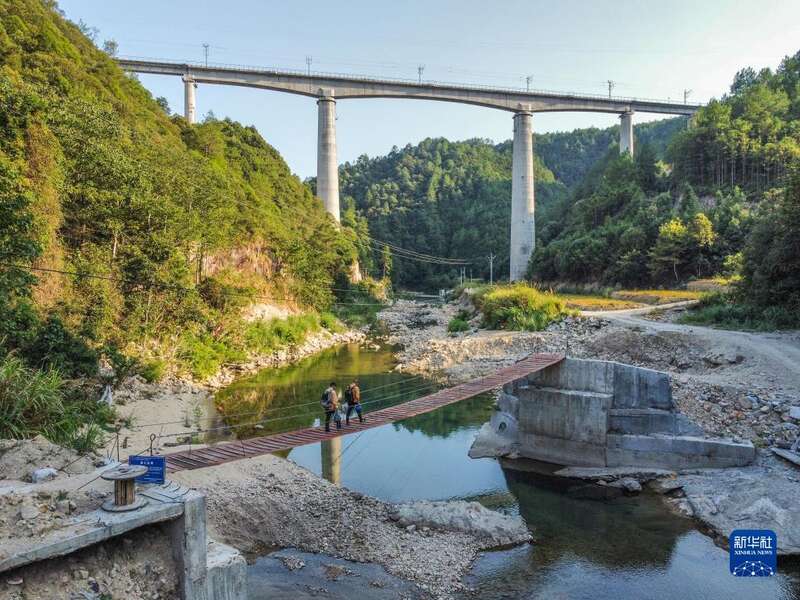 9月19日,看守员赵伟灯(右)与蔡金矿在通往赤岭隧道防洪值守点的便桥上行走(无人机照片)。