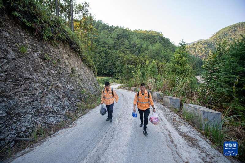 9月19日,看守员赵伟灯(右)与蔡金矿在前往赤岭隧道防洪值守点的山路上行走。