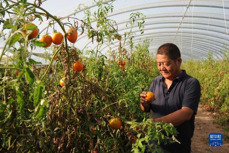 9月17日,内蒙古五原县种植大户邢雷在和胜乡黄柿子现代科技产业示范园采摘黄柿子。