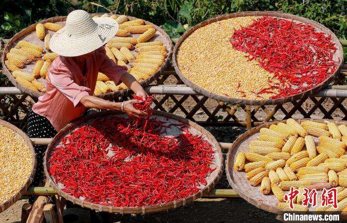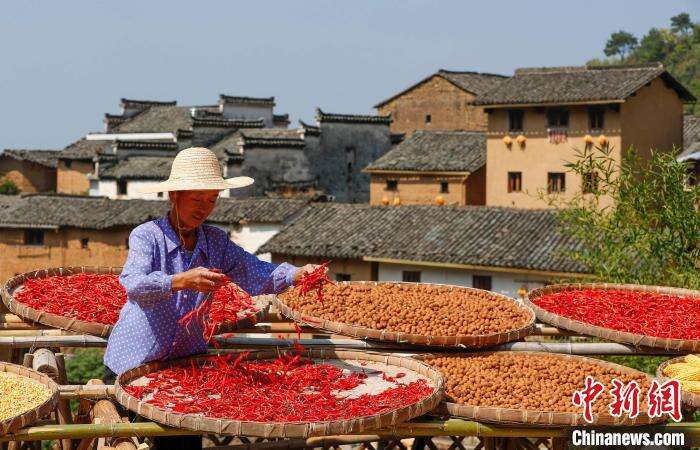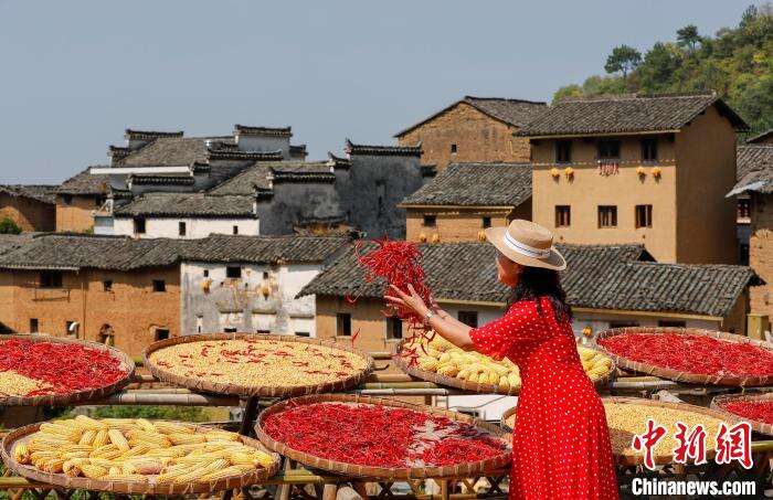 9月19日,在安徽省黄山市歙县阳产村,村民正在土楼前晾晒农作物。仲秋时节,在安徽省黄山市歙县深渡镇阳产村,村民利用晴好天气将收获归仓的红辣椒、玉米、山核桃等农作物晾晒在土楼前,五彩斑斓的农作物与鳞萃比栉的土楼交相辉映,描绘出一幅山村土楼丰收“晒秋”图。