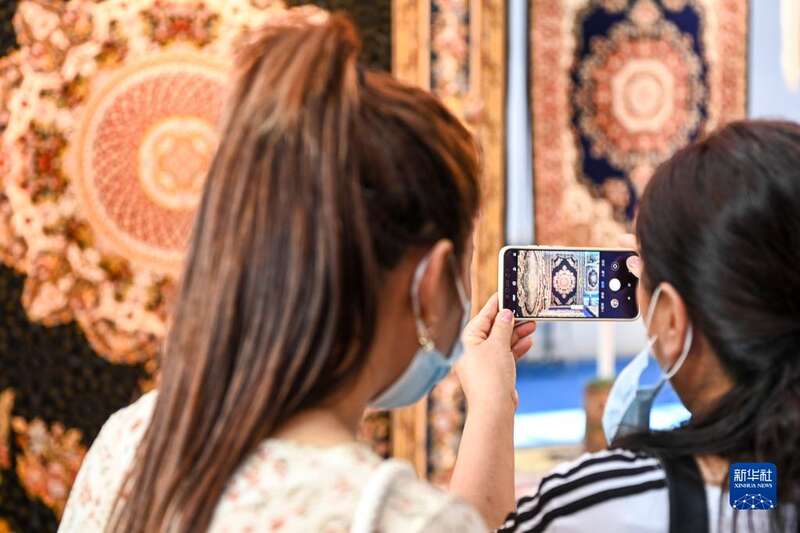 9月19日,在东博会展览现场,参观者用手机拍摄地毯产品。
