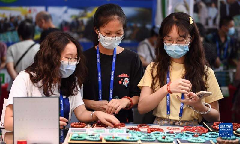 9月19日,年轻人在东博会缅甸馆购买首饰。