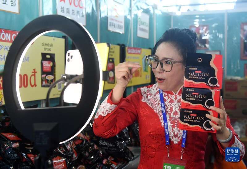 9月19日,在东博会展览现场,一名参展工作人员在通过网络推销越南咖啡。