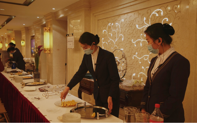 很多时候,场次很多,同一个会场一天内会举办不同形式的会议,这就需要陈维静和同事们及时更换会场的桌椅摆放、桌布布置以及核对会议流程。