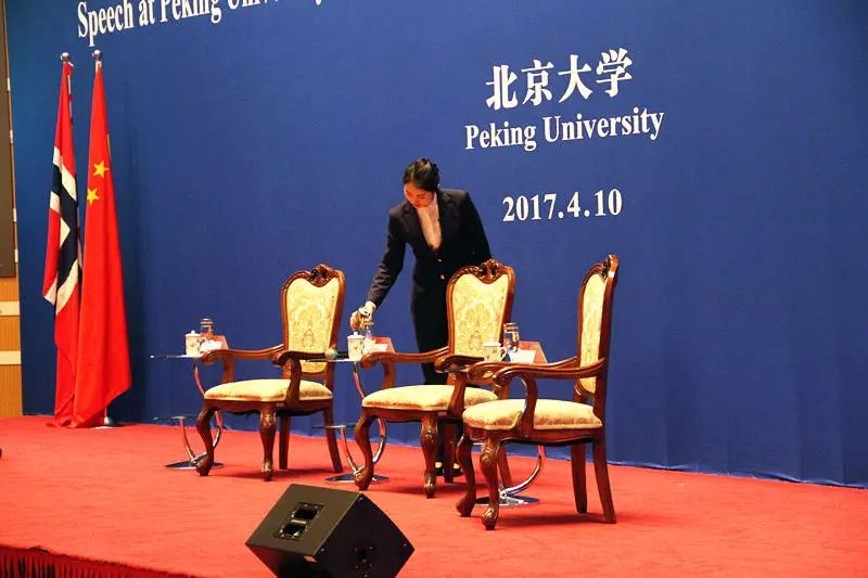 2017年,陈维静为时任挪威王国首相埃尔娜·索尔贝格北京大学演讲会提供会议服务