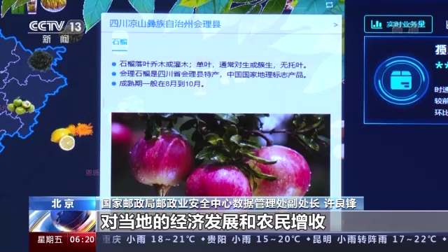 国家邮政局邮政业安全中心数据管理处副处长 许良锋:比如说在四川凉山州,农特产品的寄递占到当地业务量的六成以上。像会理的石榴,占据全县快递业务量八成以上。可以讲,会理的石榴对当地经济发展和农民增收起到重要作用。像新疆的喀什,除了传统的哈密瓜和葡萄之外,得益于行业的冷链技术和时效的提升,伽师的西梅成为新晋的网红水果。
