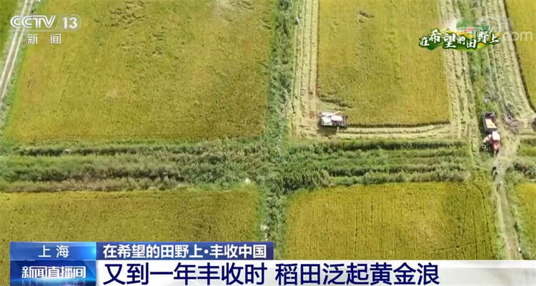 这里是上海市奉贤区,今年种植的17万亩水稻已经陆续进入成熟收割期,当地正抢抓晴好天气开镰收割。稻田里,机器轰鸣,农机手们驾驶着收割机在金色的稻田中来回穿梭,收割、脱粒、装车、稻秆粉碎,一派繁忙景象,隆起的谷堆展现着今年的好收成。