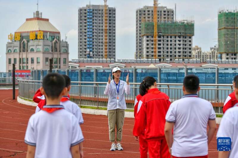 9月20日,齐河县第六小学学生在空中运动场上体育课。