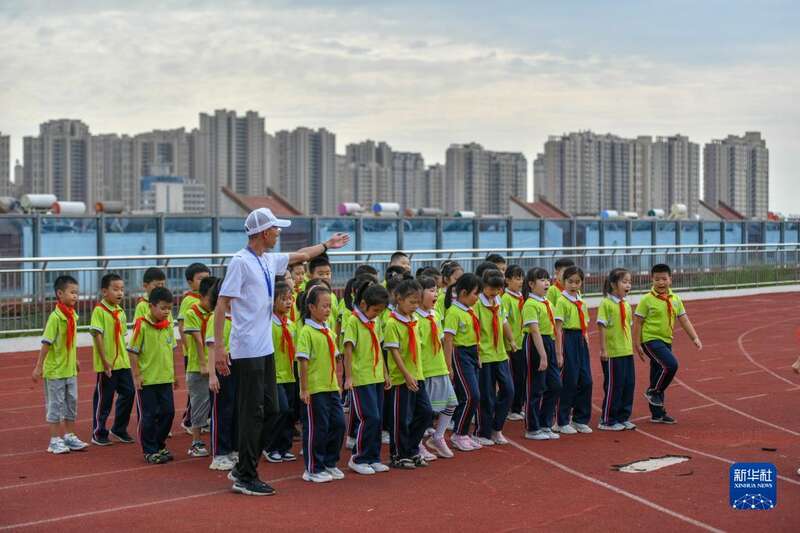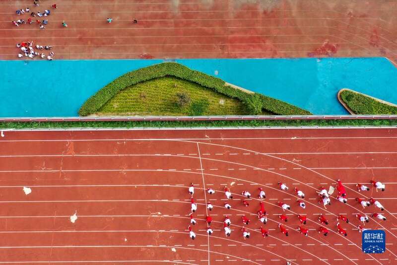9月20日,齐河县第六小学学生在空中运动场上体育课(无人机照片)。