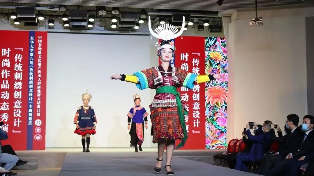 非遗技艺在国际化的魔都生根开花、非遗传承人与年轻大学生结对学习、传统刺绣创意与时尚设计联袂秀演、大山里的绣娘登上国际时尚舞台……学校作为“中国非遗传承人群研修研习培训计划”首批定点研培高校,自2016年9月以来,已成功举办八期传统刺绣创意设计非遗传承人研培班。参加研修的刺绣传承人二百余名,培训非遗管理干部及师资近百人,举办研培作品动态展演、静态展示近三十次,参展作品千余件套。学校非遗研培成果多次亮相国际时尚舞台,走入进博会、中国非物质文化遗产研培优秀成果展等,彰显文化自信。