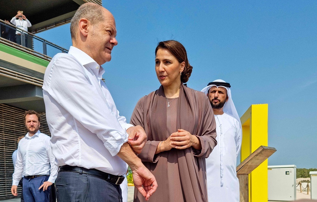当地时间2022年9月25日,阿联酋阿布扎比,德国总理奥拉夫·朔尔茨(左)和阿联酋气候变化和环境部长Mariam Almheiri参观红树林公园。