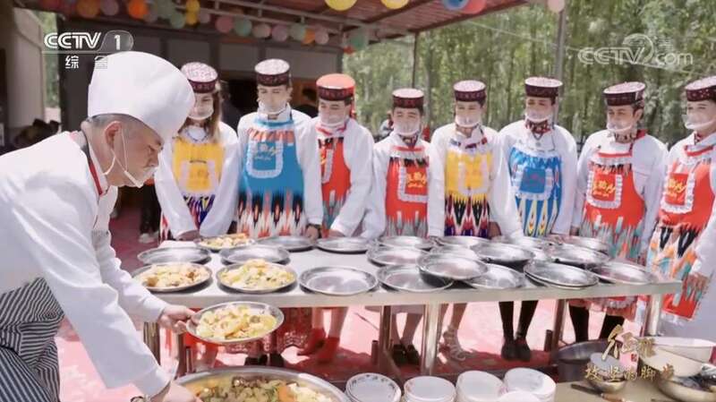 穿上厨师服,热书记秒变“热大厨”。今天的订婚礼来了150位宾客,热合曼一刻也不得闲,他准备的主菜是大盘鸡,这在村里的宴席中是拿得出手的“硬菜”。