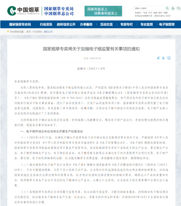 中新网9月29日电 国家烟草专卖局29日发布《关于加强电子烟监管有关事项的通知》。