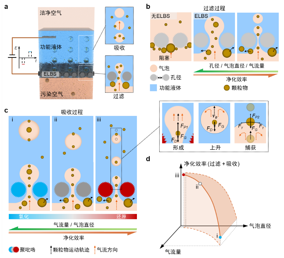 该研究首次运用“响应性液体门控技术”提出不同微尺度颗粒物在水界面上的高效过滤与吸收的核心机制,打通了现有空气净化中从过滤吸收、防污防腐、抗菌除臭到长期运行的技术难关,解开了液体作为结构与功能材料如何实现电化学可控微泡及其三相界面上高效传质的难题。
