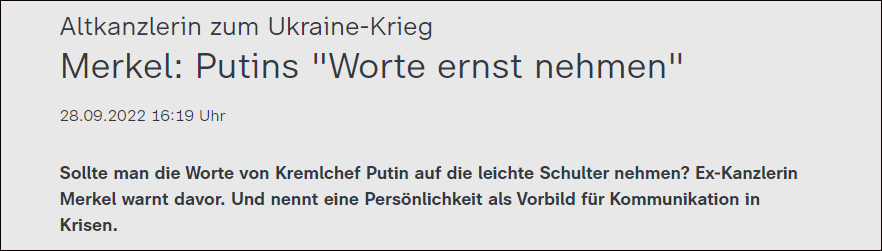 “你应该严肃对待他的话(Worte ernst nehmen)”,默克尔提醒道,西方国家不应该从一开始就认为普京的讲话是虚张声势并予以驳斥,而是应该严肃对待。她强调:“这绝不是软弱或绥靖的表现,而是一种政治智慧的表现——这种智慧将有助于保留回旋余地,甚至有助于开发新的回旋余地。”