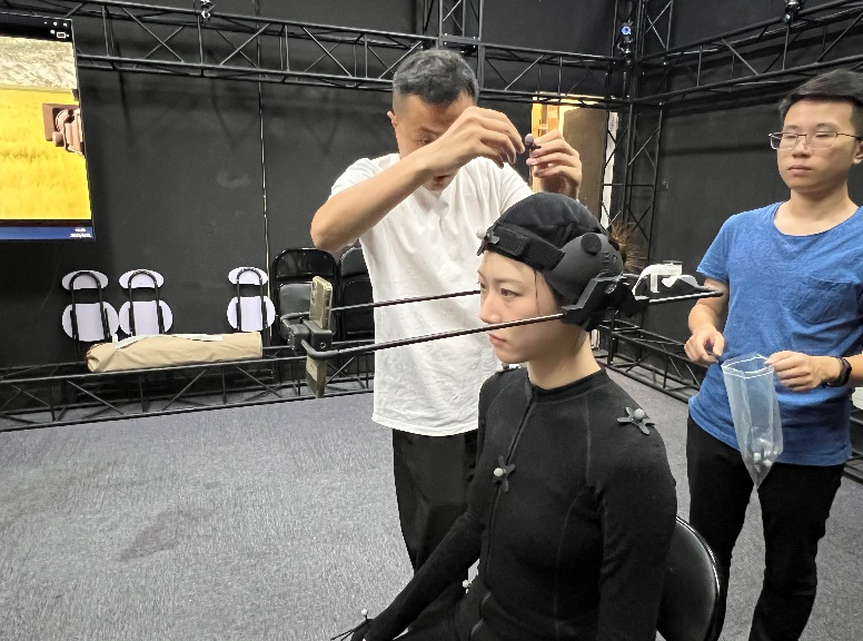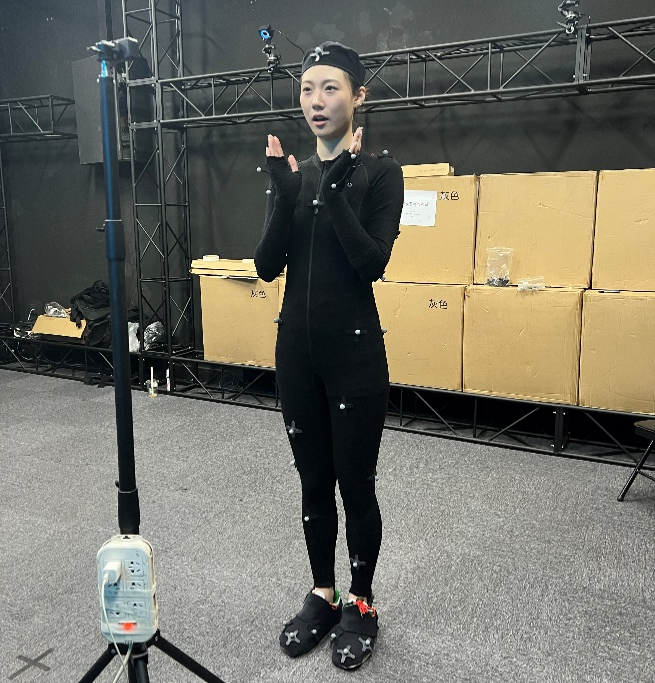 为了让“灵”拥有和专业主持人一样的手势动作,团队聘请了主持人在动作捕捉室中穿戴动捕设备进行播报动作的真人演绎,并通过光学标记点反射得到相应骨架的位移,使用OptiTrack动作捕捉系统采集专业主持人的动作,搭建主持动作库,最大限度的还原专业主持人的播报动作。