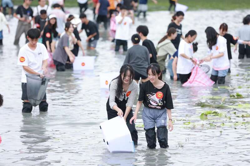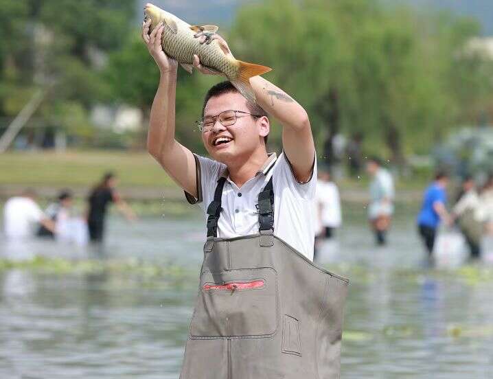 中国青年报客户端讯(中青报·中青网记者 李剑平)抓鱼、采藕、割水草。近日,温州大学生命与环境科学学院在校内明心湖,组织学生进行劳动教育与水环境治理实践课。“当它游到面前,我用身体一下子压住它,抓到了。”该校章奕同学抓住了1.2公斤的“鱼王”。湖面瞬间热闹起来,罗非鱼、草鱼等纷纷被同学们抓入篓中。