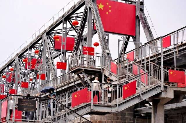 △黑龙江哈尔滨的松花江铁路景观桥上挂起近千面五星红旗和红灯笼,市民游客来到桥上拍照打卡,记录下了这一抹鲜艳的红色。