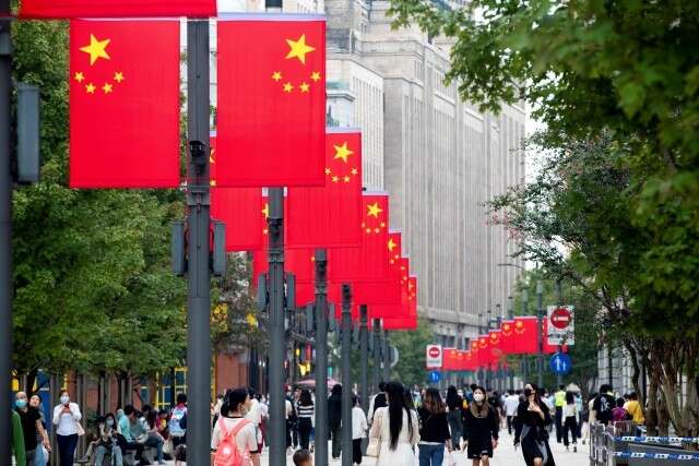 △上海,从南京东路步行街到新松江路沿线,五星红旗迎风飘扬。