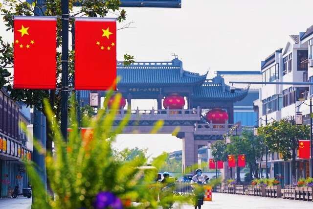 △江苏昆山的古镇,“中国红”洋溢在大街小巷。